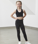 89% nylon/11% elastane. Seamless knit. Racer back style. Self fabric bound neckline, armholes and racer back. Self fabric mesh used for front straps, V insert and back panel. Removable padded cups (age 11-13 only). Ribbed hem. Tear out label.